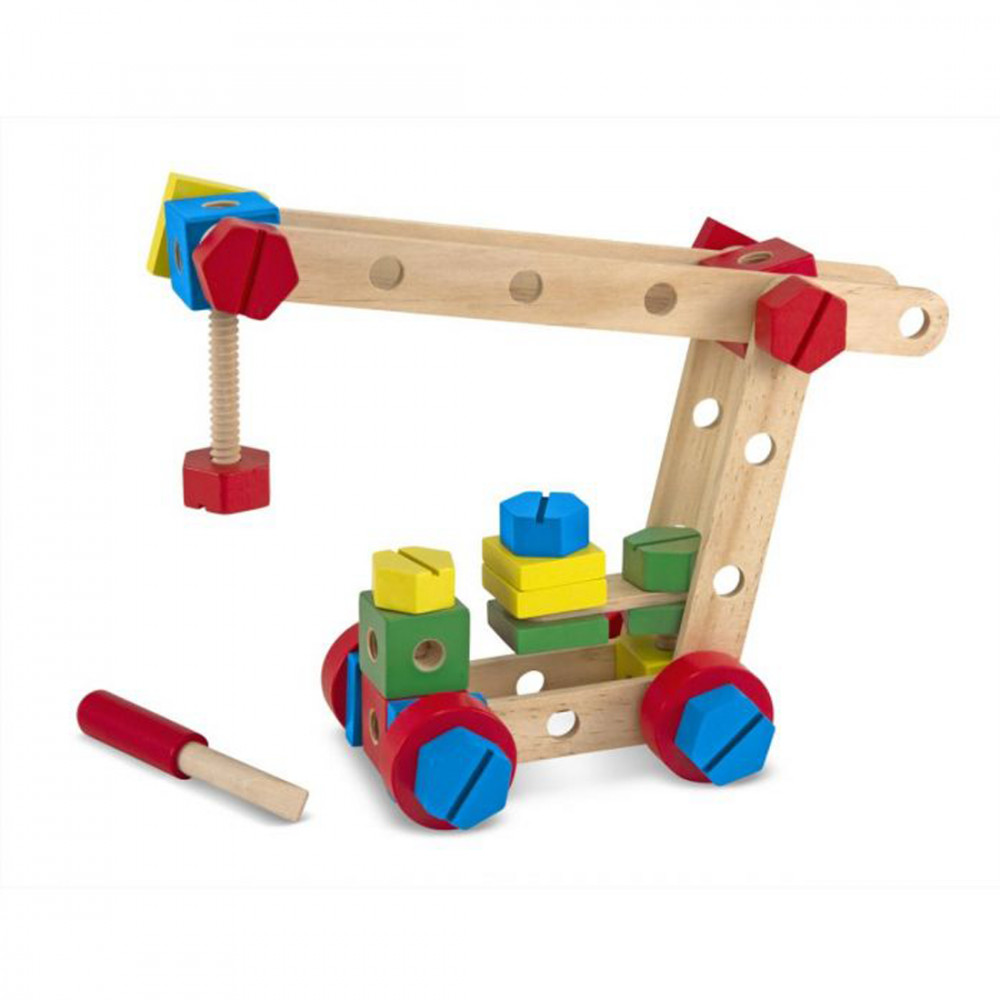 Ez a 48 darabos építőelemeket tartalmazó játék készlet (csavarok, alátétek, csavaros anyák, könnyen megfogható csavarhúzó) önfeledt órákat biztosít gyermeke számára az építkezés és szerelés világában. A készletet egy erős fadobozban lehet tárolni, melynek oldalán szerelési útmutatót is találsz motorkerékpárhoz, repülőhöz, versenyautóhoz, daruhoz. Egy csipetnyi képzelőerővel és pár kreatív csavarhúzással alkotások százait hozhatod létre ezzel a készlettel. Játék közben fejlődik a gyermeked finom motoros és problémamegoldó készsége, a kéz-szem koordinációja. További instrukciókat is tartalmaz a készlet, mellyel alapvető matematikai tudáshoz juthat a gyermek.