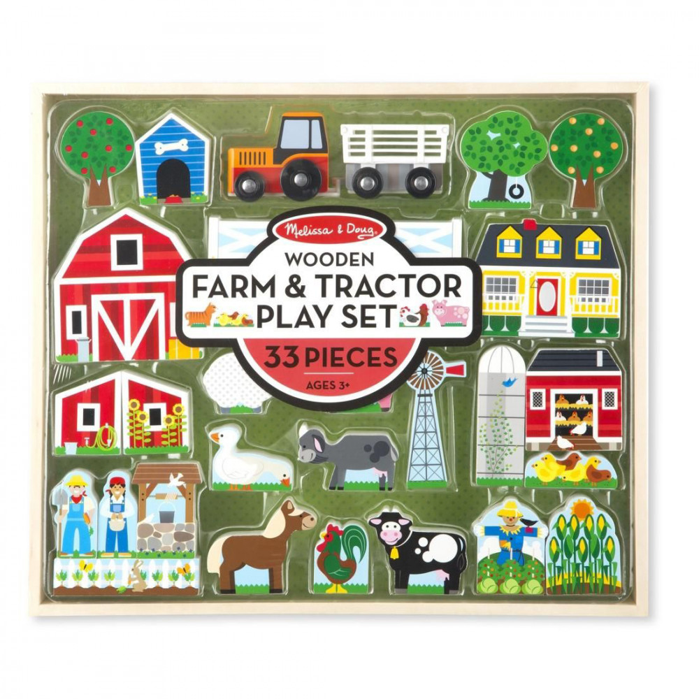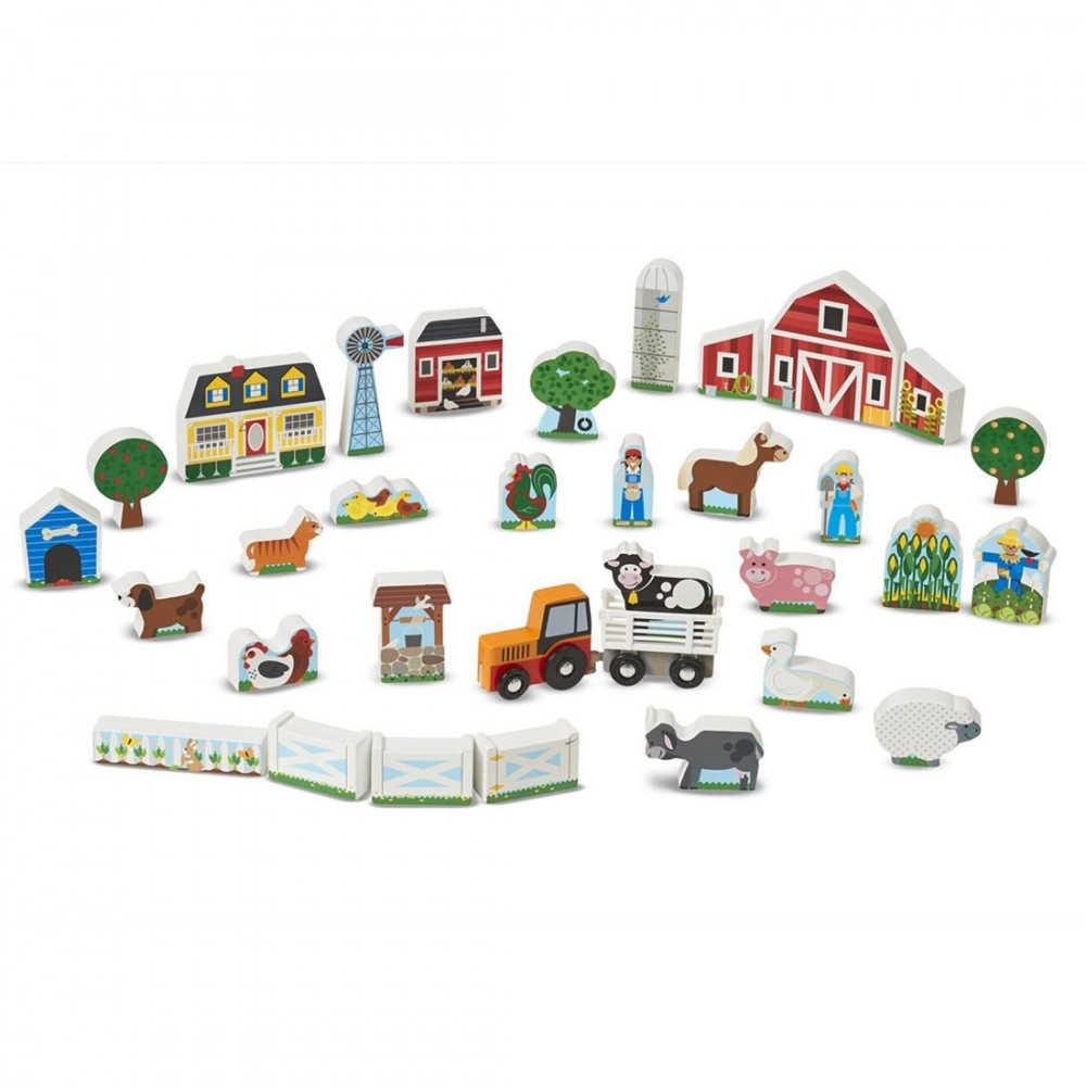 Építsd fel kockáról kockára ezzel a készlettel saját álomvilágodat. A 33 darabos farm témájú készlet, állatokat, épületeket, pótkocsis traktort tartalmaz, amibe pont bele tudod illeszteni és szállítani a farm állatait. A fából készült kis játékelemek csodásan és részletgazdagon díszítettek az egyik oldalukon. Az elemek alkalmasak csoportosításra, számolásra, de még egymásra is pakolhatod őket ezzel is javítva a finom motoros készséget, a számolási ismereteket, a történet elbeszélési képességet és a képzelőerőt. A játékot legizgalmasabban a Mellissa & Doug játékszőnyegén lehet játszani. Ajánlott 3 éves kortól.