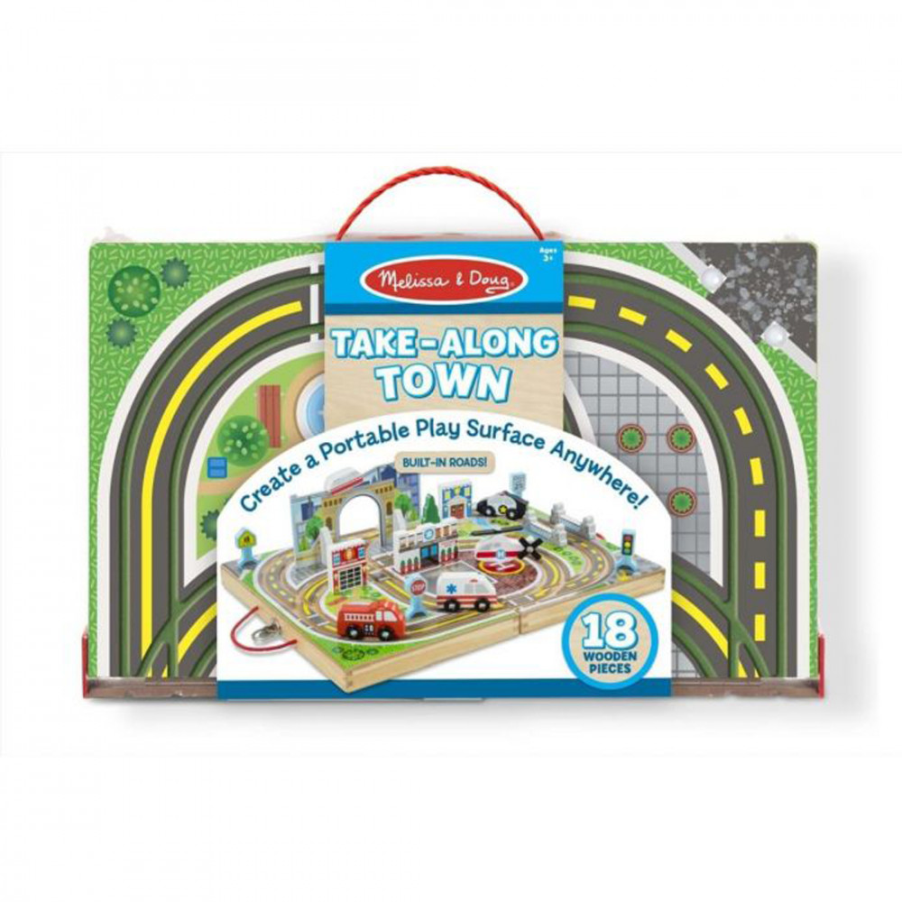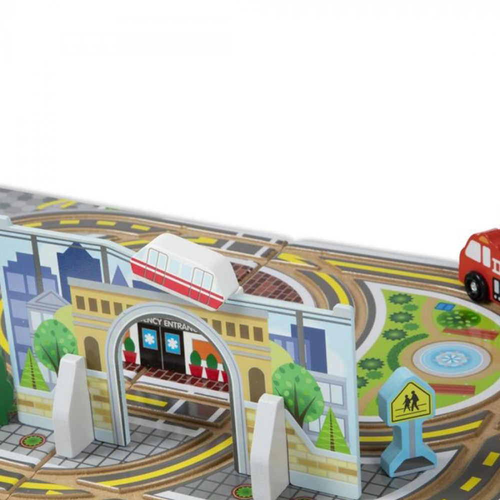 A beépített sínek, a színes táj és a vidám játékdarabok által a gyermekek fantáziája szárnyalni fog…, és ez még nem minden, mert ezt a játékot bárhova magukkal tudják vinni köszönhetően az összehajtható, erős, fából készült tároló doboznak, melynek felszínén került kialakításra a játéktér, beépített sínekkel a járművek (rendőrautó, mentőautó és tűzoltó) részére, valamint rendelkezésre áll egy fából készült helikopter is a gyorsabb életmentés céljából. Állítsd fel a hidat, egy városi alagutat, avagy az egysínű vasutat, mely a város felett száguld végig. A fából készült játékelemek között megtalálhatóak az épületek, KRESZ táblák, és egy fa, melyek csak tovább ösztönzik a fantáziadús játékot. Minden elemet rendezetten lehet tárolni az összecsukható dobozban, melynek kényelmes füleivel bárhova el lehet vinni azt. És a dobozban még sok hely marad más játék számára is. Legyen élvezetes a játékidőtök. Támogatja az önálló játékot és a motoros készségek fejlesztését.Részletek:- 18 darabos városi játékkészlet fából készült tároló dobozzal, mely összecsukható és kinyitható a felszínén játékasztallal, beépített sínekkel- tartalmaz négy fából készült járművet, amivel segítségre siethetsz, és életet menthetsz: rendőrautó, mentőautó, tűzoltó és helikopter- állítsd fel a hidat, a városi alagutat az egysínű vasúttal, mely a város felett száguld végig, az épületeket, a KRESZ táblákat, és a fát- sok hely van a játékelemek tárolására és a tartó egy kényelmes füllel is el van látva a szállításhozFedezd fel a játék számtalan formáját:- RENDEZZ: rendezd csoportba a járműveket, KRESZ táblákat, épületeket és az egyebeket, majd számoljátok meg mindegyik csoport elemeit. Melyikben van a legkevesebb? És a legtöbb?- A VÁROS KÖRÜL: Állítsd fel az összes elemet a pálya körül. A rendőrkapitányságtól kiindulva hajts körbe a pálya körül, és közben jelentsd a kapitányságnak, hogy mit látsz a városban- MENTS: Az alagút környékén baleset történt. Döntsd el, hogy melyik jármű szükséges a mentéshez, és siess vele a helyszínre- VÁROSI MESÉK: Mesélj történetet a városban élő és dolgozó emberekről. Lehet, hogy valaki a vasúton utazott, miközben az alagútban elhaladt a tűzoltó autó? És mi történt utána?