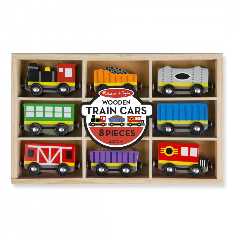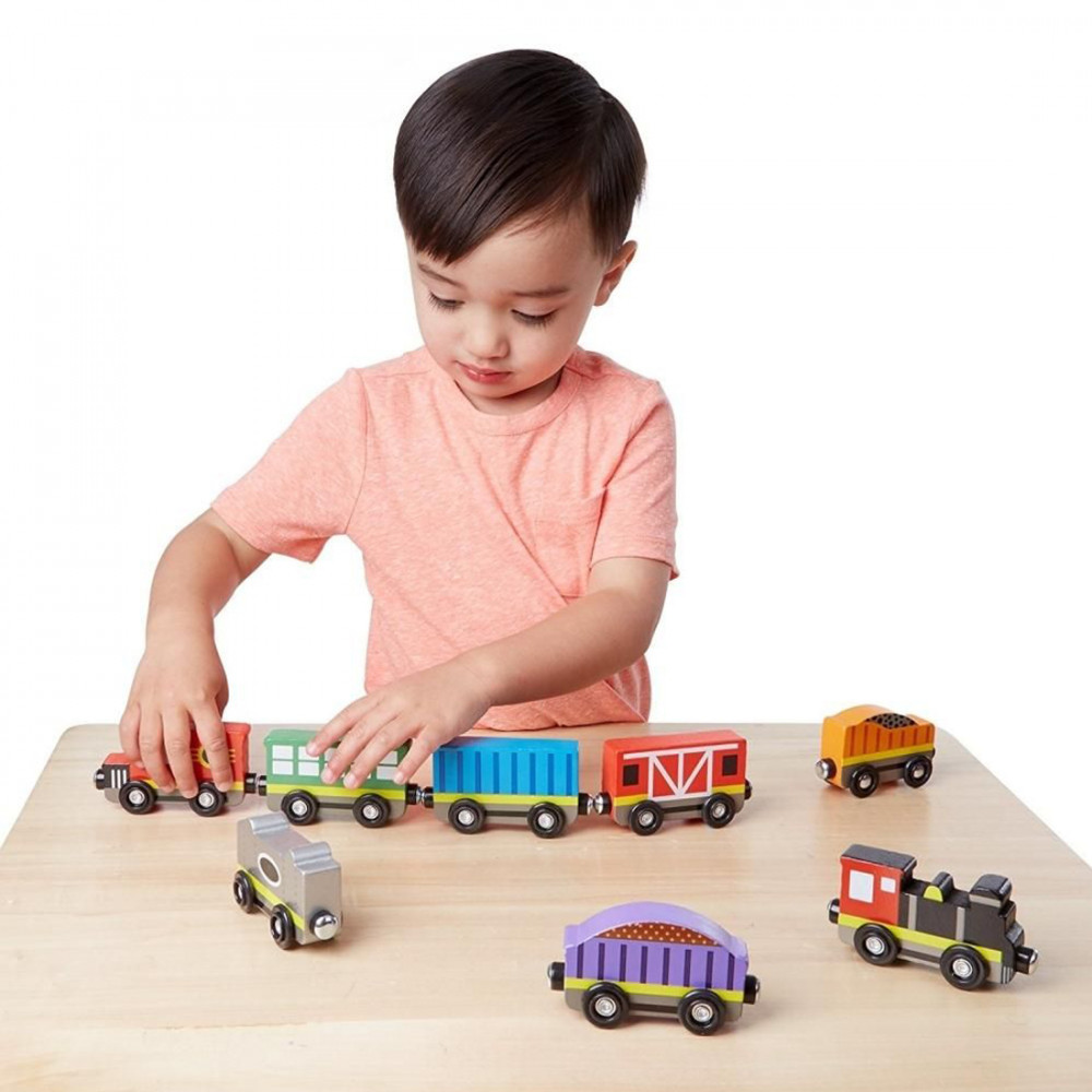 Felszálláááás! A vonat hamarosan indul! Ez a játék 8 kiváló minőségű fából készült vagont tartalmaz, melyek mérete egyenként kb 10 centiméter hosszú és mágnessel kapcsolódnak egymáshoz. A varázslatos, élénk színekkel festett vagonok között található egy gőzmozdony, szenes vagon, személyszállító vagon és még sok más. Ezt a készletet a Melissa & Doug játékszőnyeghez tervezték, mellyel kiegészítve igazán kiváló szórakozást nyújt a játékidőre gyermekének. A játék egyes elemei rendszerezetten tárolhatók a játékhoz biztosított, fából készült tálcán.