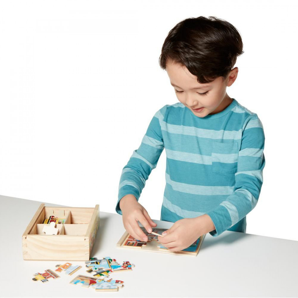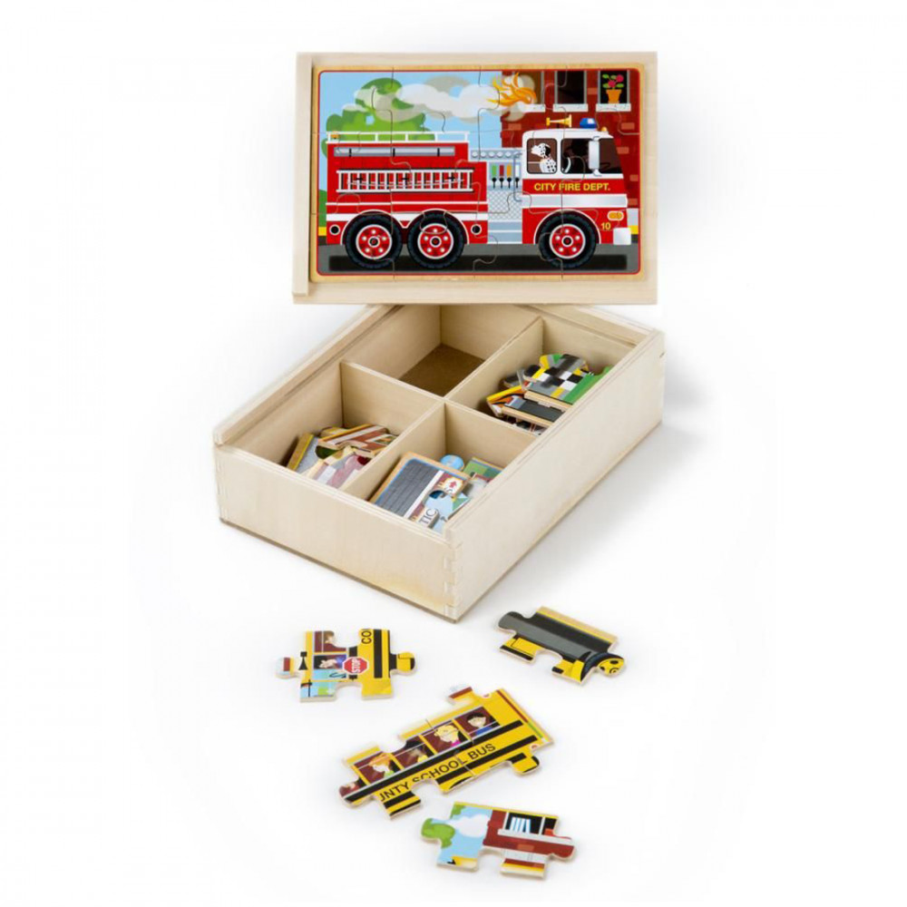 A készlet tartalmaz 4 darab, egyenként 12 puzzle-ből álló kirakót. A külön rekeszekben tárolható kirakósok versenyautót, gőzmozdonyt, iskolabuszt és tűzoltó autót ábrázolnak. A puzzle darabok formakódja segítenek a pontos helyük megtalálásában. A csúsztatható fedél pedig kiválóan alkalmas felület a puzzle kirakására. Ideális játék utazáshoz! 3-6 éves korosztály számára.Mérete: 20 x 15 x 6 cm