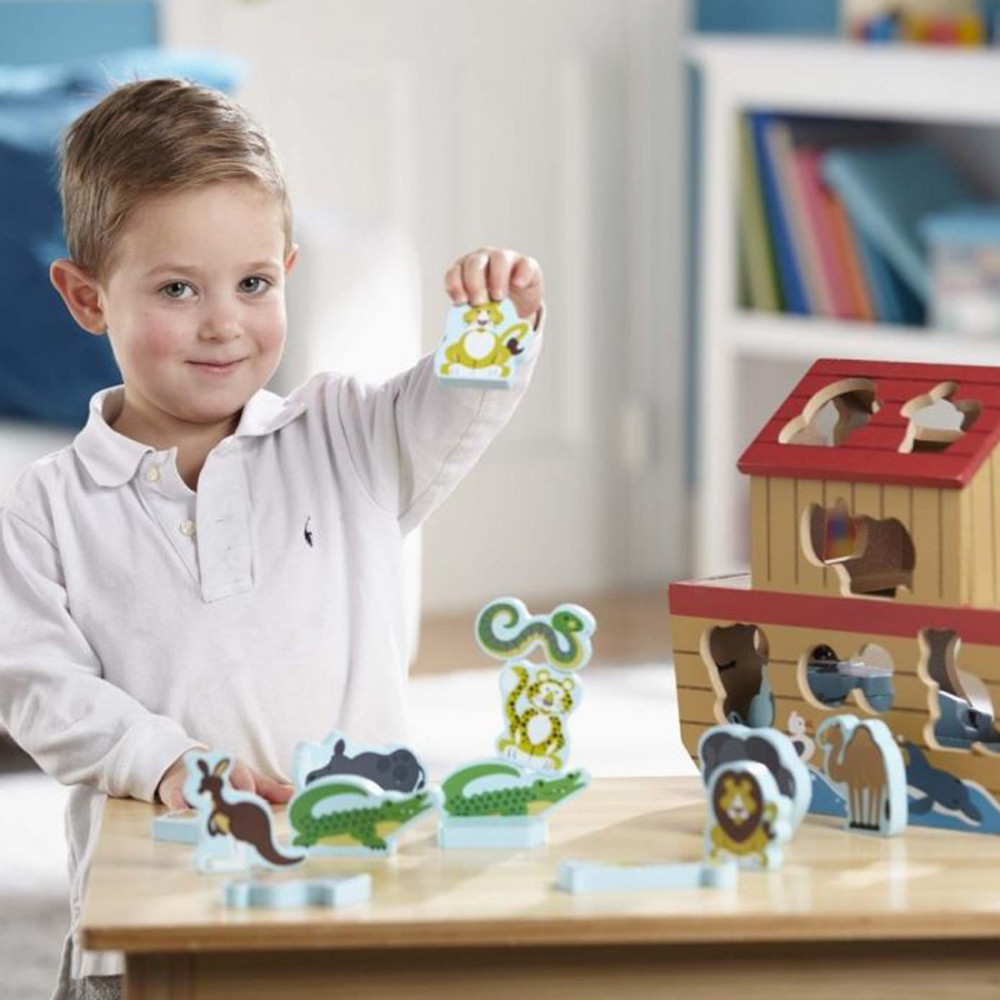 Melissa & Doug Noé Bárkája Formaegyeztető JátékIrány a fedélzet egy kis állati jó formarendező játékra kettesével! Tevék és kenguruk, majmok és alligátorok is megtalálhatóak azon bájos állatok között, akik készen állnak hajókázni ezen a fából készült bárkán. A kétszintes bárka felnyitható ajtókat és 26 állatfigurát tartalmaz, és természetesen Noét és az ő feleségét.