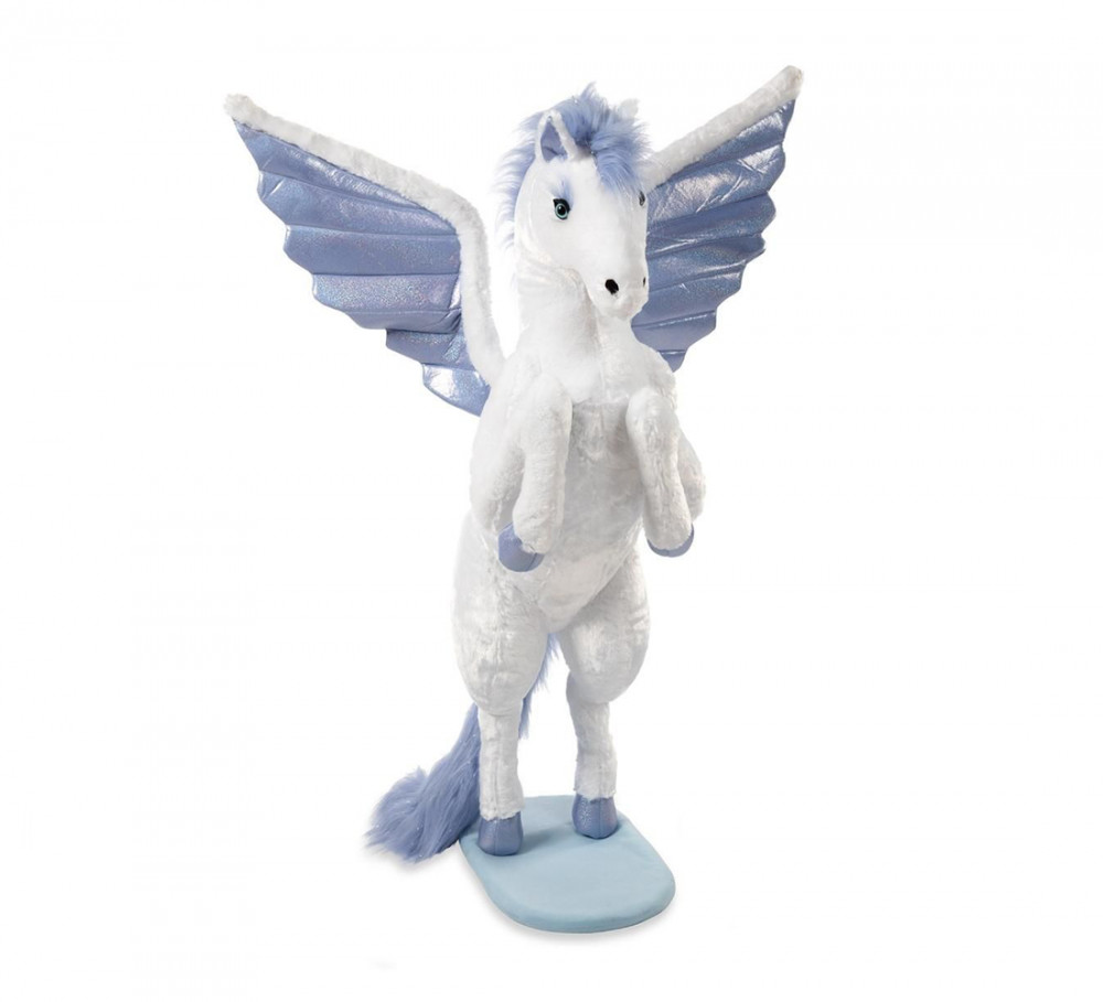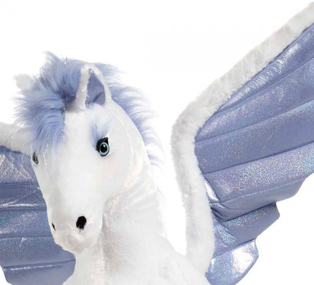 Hadd szárnyaljanak a csodás álmok! Ez a fenséges szárnyú, a hátsó lábai ágaskodó pegazus több mint egy méter magas, és készen áll arra, hogy az égbe és vele együtt a gyerekek szívébe és képzeletébe ugorjon! A pegazus puha testét selymes fehér szőr borítja, hogy még nagyobb szeretettel ölelhesse a gyermek magához, valamint csillogóan lila ékes szárnyai és patája, továbbá lila sörénye van. A kiváló minőségű kivitelezése és az erős belső szerkezete miatt büszkén állhat ez a pegazus a szobádban az elkövetkező években. A pegazus hátsó lábai egy ovális, több mint fél méter hosszú alapon állnak az extra stabilitás érdekében. Tökéletes díszítő eleme minden szobának, valamint ösztönzője a képzeletbeli kalandoknak!