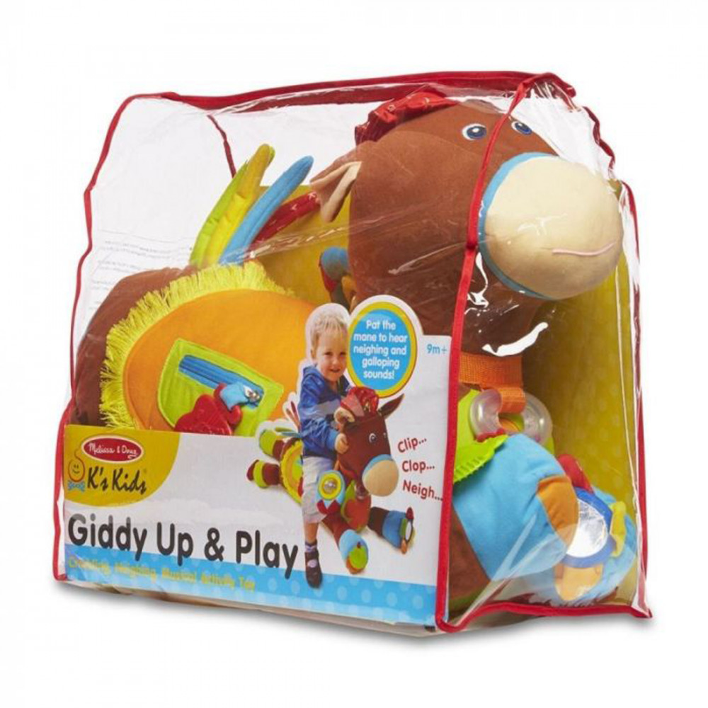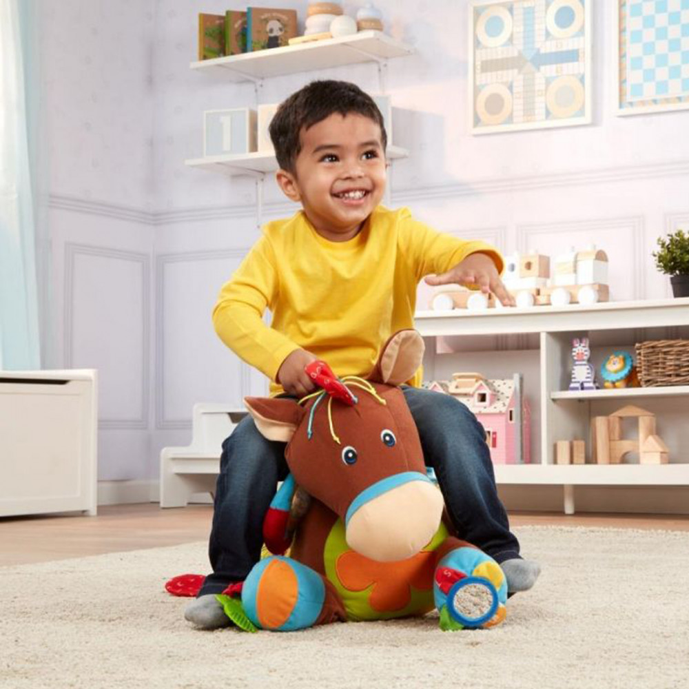 A „Pattanj nyeregbe és játssz” csábítja a babákat egy simogatásra, sőt akár még arra is, hogy nyeregbe pattanjanak! Ennek az aranyos póninak a csörgői, az anyagában mintás fülei, a gyűrhető anyaga mindig megragadja a babák figyelmét, és amikor a füleit csavargatjuk még ügető és nyerítő hangokat is kiad. Igazán ölelősen puha paci és bohókás részletekkel díszített, hogy az érzékszerveket jobban bevonja és segítse a fejlődő készségeket. Csúszásmentes alj biztonságos használatot nyújt, de csak padlón használja. A Melissa & Doug K’s Kids gyerekjátékai a legfontosabb készségek területén erősítik a korai gyermekkori fejlődést: fizikai, kognitív és társadalmi. Interaktív tervekkel és multiszenzoros funkciókkal a K’s Kids gyerekjátékai elősegíti a konstruktív játékot és az erőfeszítés nélküli tanulást, fenntartva a nagy érdeklődést és az új készségek fejlődését az egész baba- és kisgyermekkor éveiben!Részletek:- igazi bújós társ, tele élménnyel (anyag, hang és készségfejlesztő tevékenységekkel)- csavard meg a fülét, hogy hallhasd a galoppozás, nyerítés hangjait- támogatja a finommotoros készséget és a fogást; elősegíti a kézügyességet és a szem-kéz koordinációs készséget- a Melissa & Doug K's Kids gyermekjáték- és könyvcsalád tagja, babák és kisgyermekek számára- a hangot kiadó kantárt könnyű megragadni, húzni, tekerni; a törésálló tükör leköti a baba arcokkal és fényekkel kapcsolatos érdeklődését- a foltokat nedves ruhával távolítsa el- 2xAAA elemmel működik, melyet nem tartalmaz a csomagolásFedezd fel a játék számtalan formáját:- 9+ hónapos: helyezz egy a szülőről vagy a gyermekről gondoskodó felnőttről készült közeli fotót a patán található keretbe. Takard be a fülekkel, majd mikor felfeded a fotót, mondd: „Kukuuucs!”- 9+ hónapos: állítsd kihívás elé a babát, kérd meg, hogy simogassa meg a lónak azon testrészeit, amikre rámutatsz és kimondasz. Pl: homloka, sörénye, nyaka- 9+ hónapos: mutasd meg a babának a saját tükörképét, amint a baba kezdi felismerni a tükörképét, ösztönözd arckifejezésekre, például a száj kinyitására vagy lufi fújására- 12+ hónapos: segíts a gyermeknek a játék színeinek azonosításában, mondj ki hangosan egy színt, és segítsd a gyermekedet rámutatni arra- 12+ hónapos: Mutass a sörényre, és segíts a gyermekednek, hogy meghallgassa a játék hangját. Csavarjátok meg a fülét, és hallgassátok meg a vágtató zajt- 12+ hónapos: Kérd meg a gyermeket, hogy nyissa ki a cipzáras zsebet. Helyezz egy tárgyat (például képet vagy kedvenc rágókáját) a zsebbe, hogy a gyermek megtalálhassa azt- 15+ hónapos: Segíts a gyermeknek a játékon található különböző részek beazonosításában (virágszirmok, paták, fülek, farok), és közben együtt, hangosan számoljatok- 15+ hónapos: Kérd meg a gyermeket, hogy üljön a nyeregbe és tegyen úgy, mintha lovagolna. A gyermek tartsa kézben a gyeplőt vagy a füleket, és adjon ki hangokat, hogy a ló elinduljon vagy megálljon- 15+ hónapos: meséljetek egy történetet a gyermekkel a ló gondozásáról, simítsátok meg együtt a ló sörényét és farkát, majd adjatok a lónak almát (rágókát) csemege céljából... és a farmon töltött fárasztó nap végén öleljük meg a lovacskát