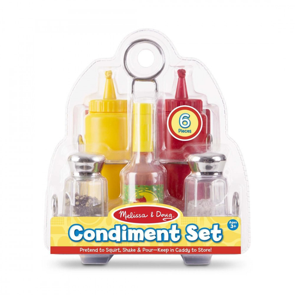 A jól felszerelt játékkonyha elengedhetetlen kellékei ezek a fűszerek, amelyek úgy hangzanak és úgy néznek ki, mint az igaziak! A hat darabos készlet ketchupot, mustárt, sót, borsot és csípős szószt tartalmaz, és egy praktikus fémdobozba van csomagolva, hogy minden rendben legyen. A legjobb az egészben: A só és a bors tényleg "rázza", a csípős szósz tényleg "önti", a ketchupot és a mustárt pedig önteni lehet! Ezek a csodálatosan tartós játékdarabok úgy készültek, hogy számtalan kulináris kalandot kibírjanak.