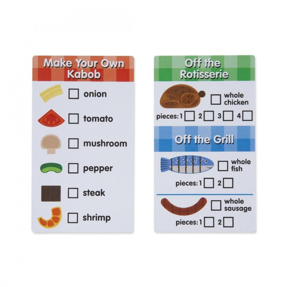 Grillezzünk, szeleteljünk és forgassunk! Készíts el egy fantasztikus lakomát ezzel a deluxe, fából készült barbecue játékkészlettel! A 24 darabos készlet olyan kedvenc grillspecialitásokat tartalmaz, mint például egy egészben sült grillcsirkét, ami egy nyárson forog, egy nagy halat, kolbászt, garnélarákot és zöldségeket is a kebabhoz. A finomságok elkészítéséhez használd az ecsetet, a hús forgatásához a lapátot, megfogásához a húscsipeszt és felvágásához a kést. Ezt a grillrácsot könnyű felhevíteni; csak állítsd be a hőfokot a barbecuen a csavarható gombok segítségével, és forgasd a nyársat, hogy a grillcsirke tökéletesen megsüljön! A csirke-, hal- és kolbászdarabokat tépőzár tartja össze; a kés segítségével könnyedén fel tudod vágni őket. Étkezés után használd a grillt az elemek praktikus tárolására! A fából készült Grill- és barbecue készlet fejleszti a kéz-szem koordinációt, a finommotoros készséget, a kreatív kifejezést és a képzeletbeli játékot.Részletek:- Deluxe fából készült grill- és barbecue készlet- 24 darabos készlet, ami tartalmaz húsokat, BBQ szószt, eszközöket, forgatható nyársat, melyek praktikusan tárolhatóak a grillben.- A könnyen megragadható lapát, ecset, húscsipesz és kés biztonságos és gyermekbarát.- A csirke-, hal- és kolbászdarabokat tépőzár tartja össze, és a kés segítségével könnyedén feldarabolhatóak.- Ösztönzi a kéz-szem koordinációt, a finommotoros képességeket, a kreatív kifejezést és az képzeletbeli játékot.