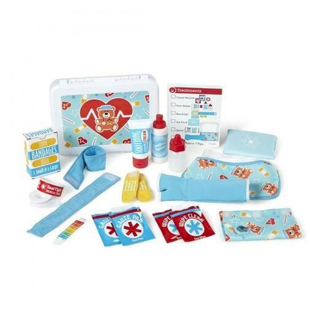 A 25-darabos Melissa & Doug Gyógyulj meg! Elsősegély Orvosi Készlet élethű kiegészítőkkel nagy segítségére lesz a kis gyógyítóknak a sérülések ápolásában! A három évesnél idősebb gyerekek eljátszhatják, hogy töréseket és rándulásokat rögzítenek gipszbe és pólyába, sebeket tisztítanak ki kendővel és gézzel, bekötözik a bibiket, és betegséget enyhítenek a tubussal, spray-jel, szemcseppel, és jeges tasakkal. Az újraírható kártya segítségével fel tudják jegyezni a kis orvosok a diagnosztizált betegséget és az alkalmazott kezelést. A készlet minden egyes darabját egy zárható elsősegély dobozban lehet tárolni, melyet könnyű tisztántartani. Ezzel a játékkészlettel a gyermekben esetlegesen felhalmozódott, orvosokkal szembeni stresszét dolgozhatja fel a kicsi, továbbá empatikus és gondoskodó viselkedésre ösztönzi. Gyújts szikrát a gyermek kreativitásában és fantáziájában és inspiráld a fiatal gyógyítókat éveken át!