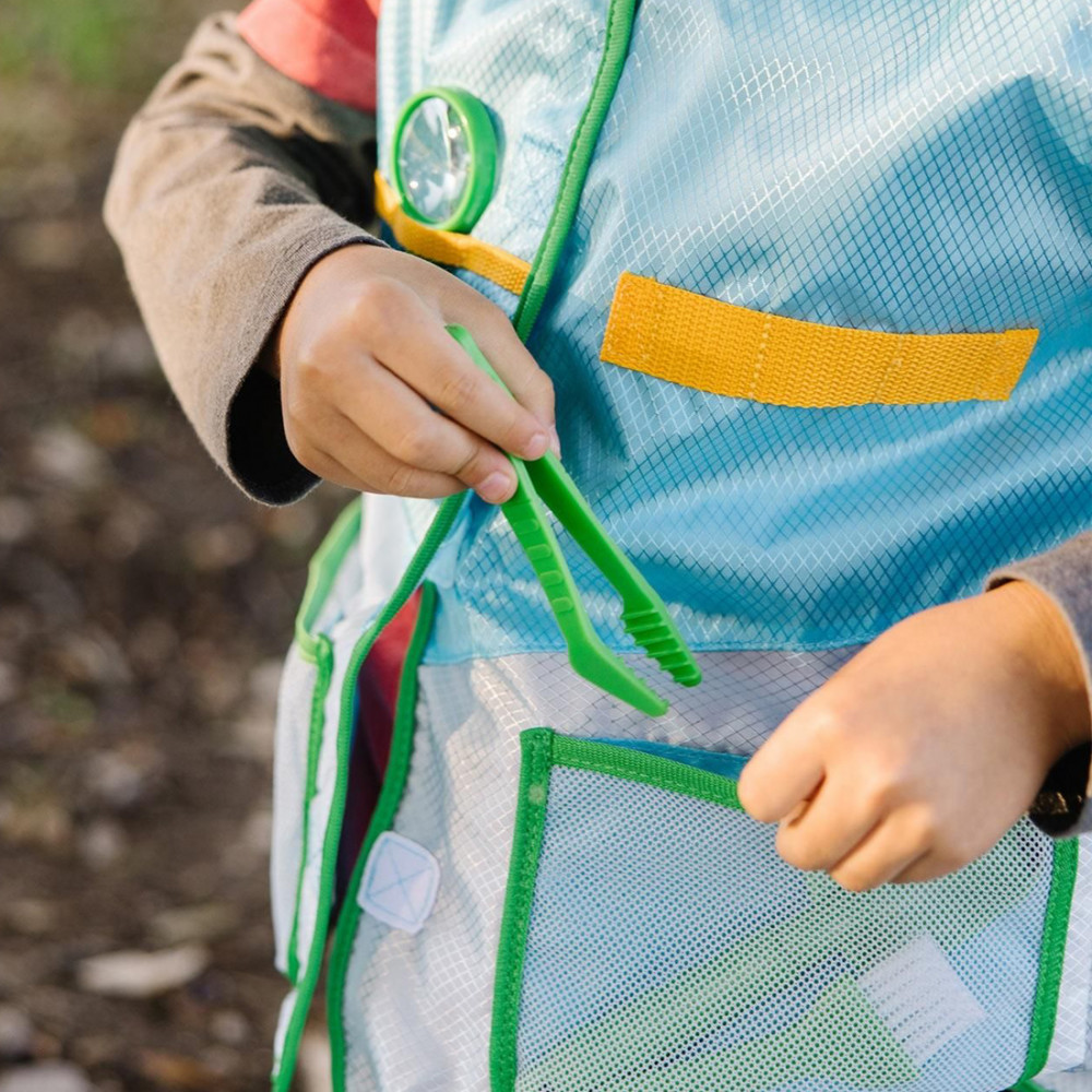 20 részes természettudós játékkészlet mellényekkel és egyéb nélkülözhetetlen kellékekkel a rovarok, sziklák, magvak, növények és levelek megfigyeléséhez, gyűjtéséhez és katalogizálásához.Gépben mosható természettudós mellény, 3-6 éves gyerekeknek megfelelő méretben, rengeteg túlméretezett zseb és kapocs szerszámokhoz, tevékenységkártyák, vágólap ceruzával és gyűjthető medál.A gyűjtéshez szükséges eszközök közé tartozik a lapát, a nagyító, a csipesz, az ecset, a mintatartó kétoldalas rekeszcímkékkel, a levélgyűjtő boríték.
