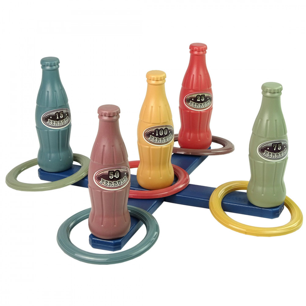 Remek ügyességi játék a karikadobálás. Tegyétek le a földre az állványt a palackokkal, álljatok meghatározott távolságra, és dobjátok az állványra a karikákat úgy, hogy fennakadjanak a palackokon! Barátok, családok számára is kiváló kültéri szórakozás, verseny, készségfejlesztő játék.