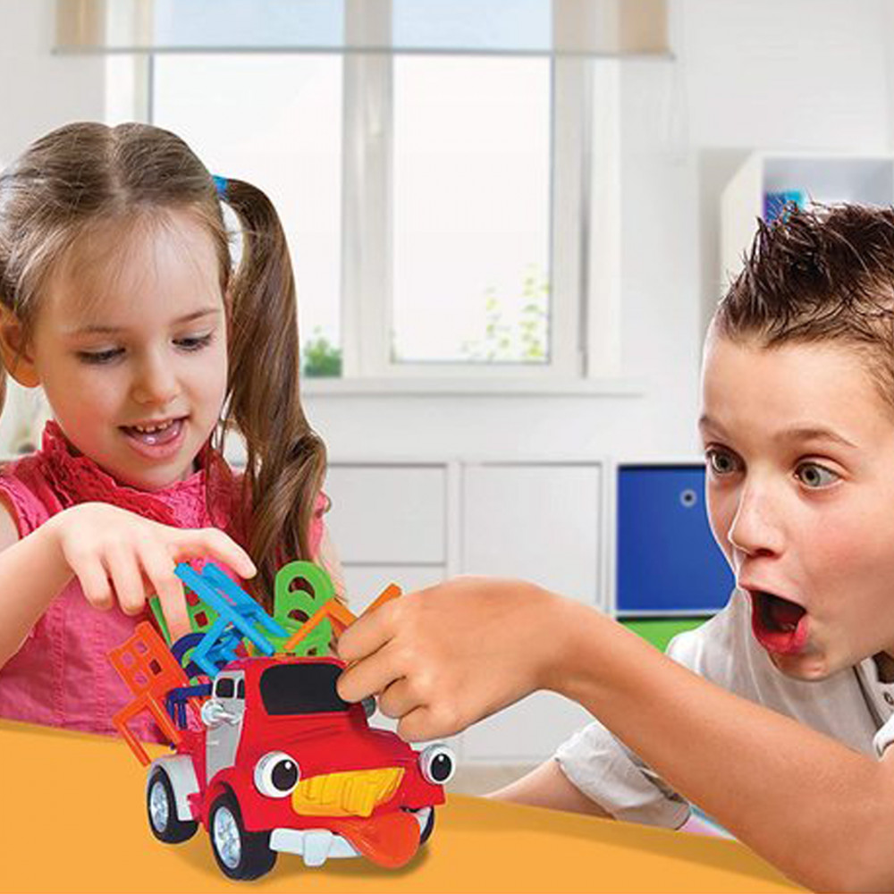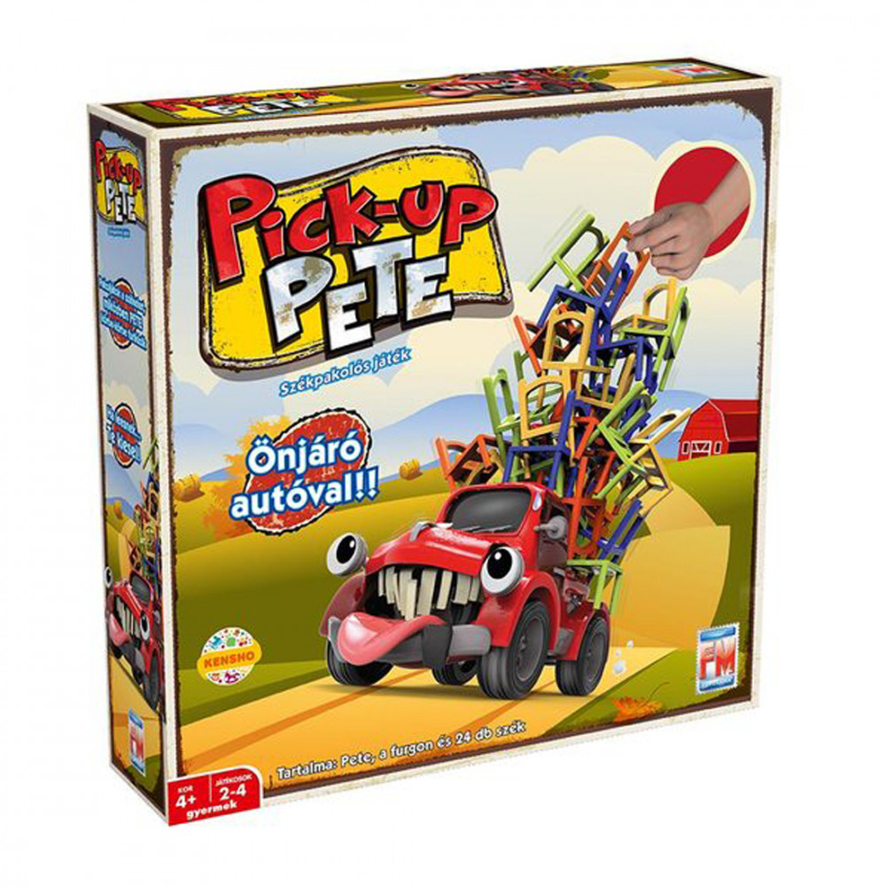 Indulhat a fergeteges móka? A szabály egyszerű, a játékosoknak székeket kell felpakolniuk a mozgó teherautóra, ám a hely szűkös, így csak tornyot építve fér fel minden bútordarab a platóra. De vajon egyben marad az óriási halom?A játékot egyszerre 2-4 játékos játszhatja. Az előkészület során minden játékos magához veszi az összes széket egy-egy választott színből, így mindenki összesen 6-6 darab ülőalkalmatosságot próbál majd ráhelyezni a teherautó platójára, miközben a kocsi köröket ír le a földön vagy az asztalon. A játékosok sorra próbálnak meg egy-egy újabb székeket felhelyezni, amikor hozzájuk érkezik Pete. Az első szék számára négy kis mélyedés biztosít stabilitást, a többi szék sorsa viszont már csak a játékosokon és a fizika törvényein múlik. Ha egy óvatlan mozdulat során a székek leesnek, a játékos kiesik a játékból, a leesett székeket pedig eltakarítja Pete útjából. Az nyer, aki előbb felpakolja mind a hat székét, vagy utolsóként marad játékban.A Pick-Up Pete társasjáték az egyszerű szabályok miatt akár már óvodás kortól játszható.Tartalom: A játék elemmel működik (2 X AA). A csomagolás az elemeket nem tartalmazza.