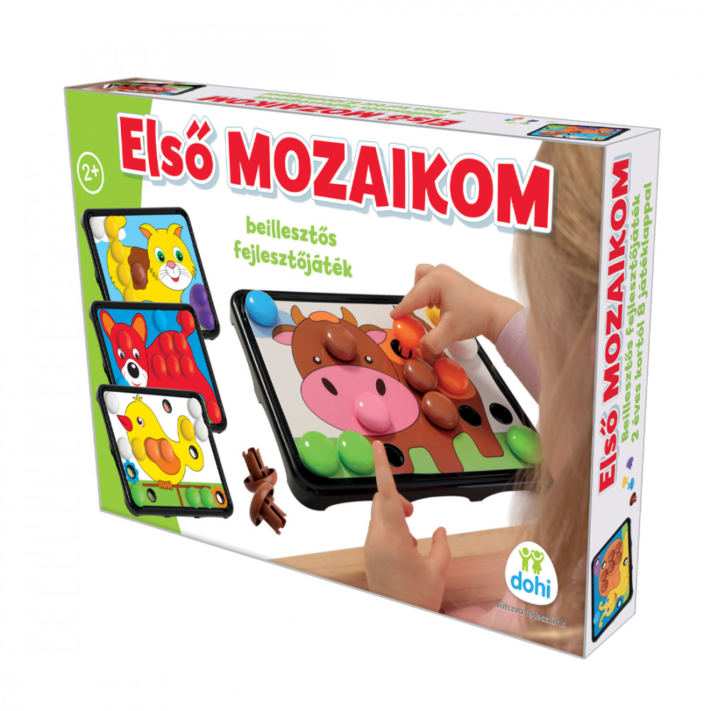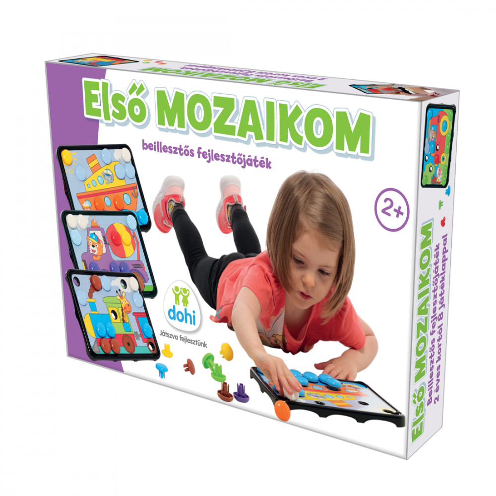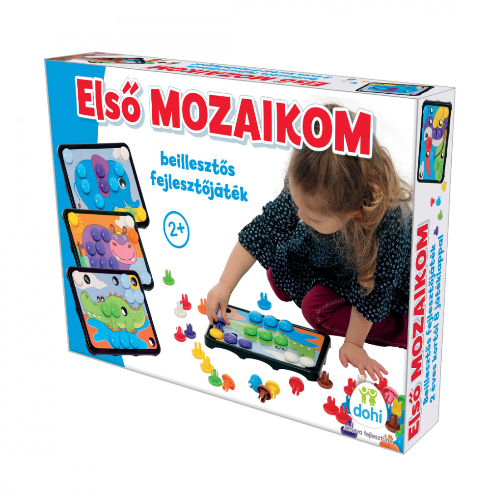 Minden gyereknek van egy egyedi jele az oviban, és ennek a nagyszerű játéknak köszönhetően a kicsik nyolc legnépszerűbb és leggyakoribb óvodai jelet tölthetik meg színekkel a beillesztő gombok segítségével. Az Első mozaikom játékcsalád kifejezetten a két éves gyerekek számára lett fejlesztve, ennek megfelelően nem tartalmaz olyan apró elemet, amelyeket a kicsik lenyelhetnének, ugyanakkor a játékban található gombok elhelyezése a kép megfelelő színű részén fejleszti a finom-motorikus készségeket és a színfelismerést.