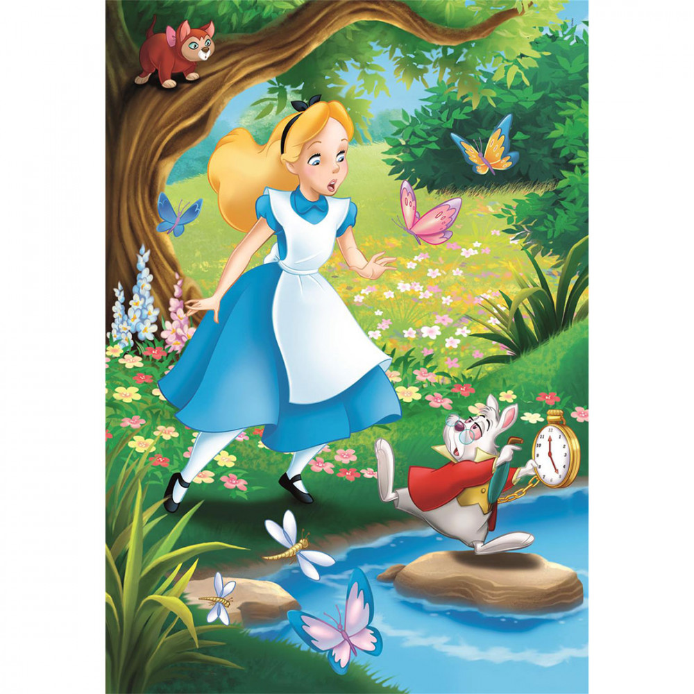 A 3 x 48 darabos Szuper színes Disney Klasszikusok puzzle képén a jól ismert rajzfilmek, Alíz Csodaországban, Pán Péter és Robin Hood mesehősei elevenednek meg.