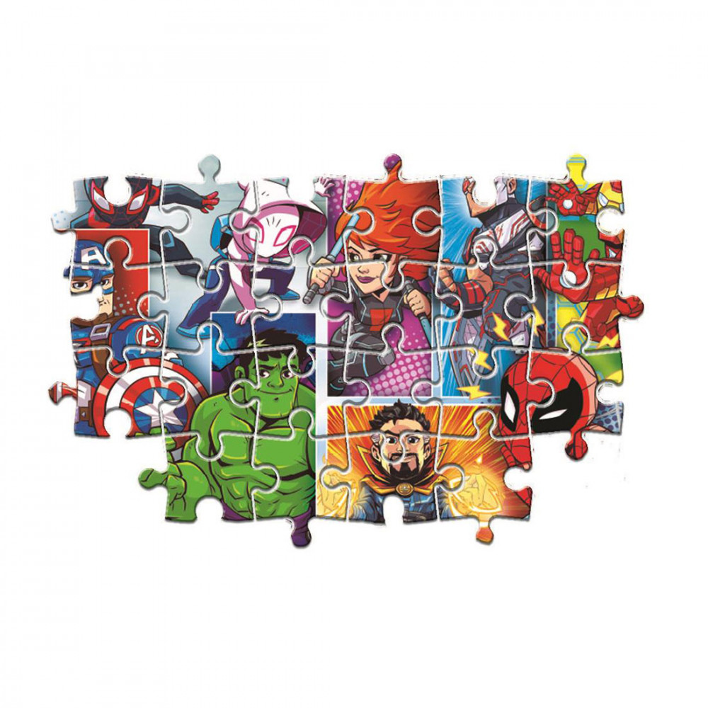 Kisfiad oda van a Marvel szuperhőseiért, és szeretnéd meglepni őt egy különleges ajándékkal, akkor tökéletes választás lehet ez a puzzle. A képen a legnépszerűbb Marvel szuperhősök láthatók egy képregény szerű montázzsal, mely nagyon jól mutat. A puzzle maxi méretű darabkákból rakható ki, melyekből 24 db található meg benne. A képet élénk színekkel látták el, így lehet még szebb a végeredmény. Nem csak remek szórakozás, de remekül fejleszt is, hiszen rá kell jönni, melyik darabka hova illik, valamint türelemre és kézügyességre is szükség van közben.