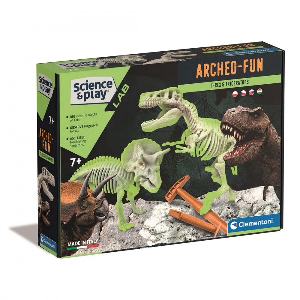 Keltsd életre a dinoszauruszok világát saját kezűleg! A Clementoni Archeo-Fun T-Rex és Triceratops régészeti készlet minden fiatal felfedező álma: egy izgalmas ásatási kaland, ahol két legendás dinoszaurusz csontvázát kell kiásni, összeállítani és felfedezni.