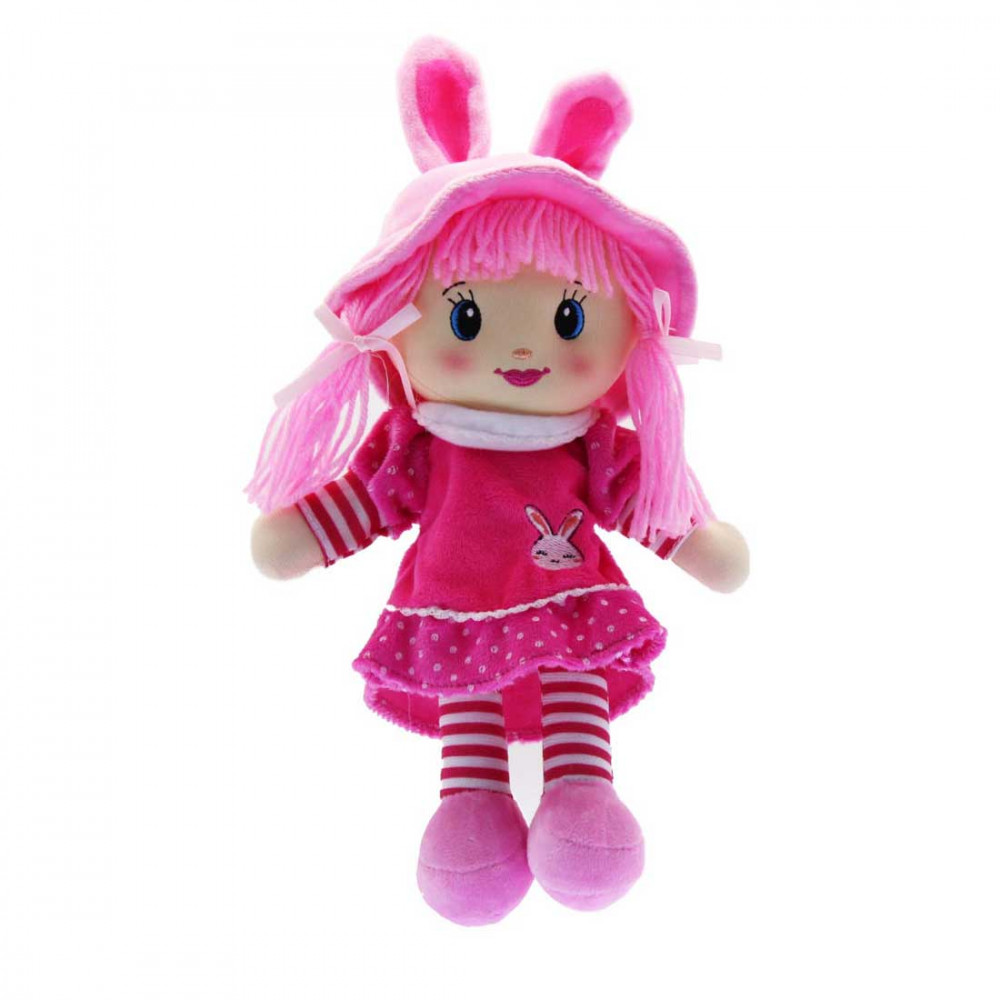 Ennek a kedves kislány babának rózsaszín ruhája és nyuszifüles sapkája van, és alig várja, hogy veled játszhasson.