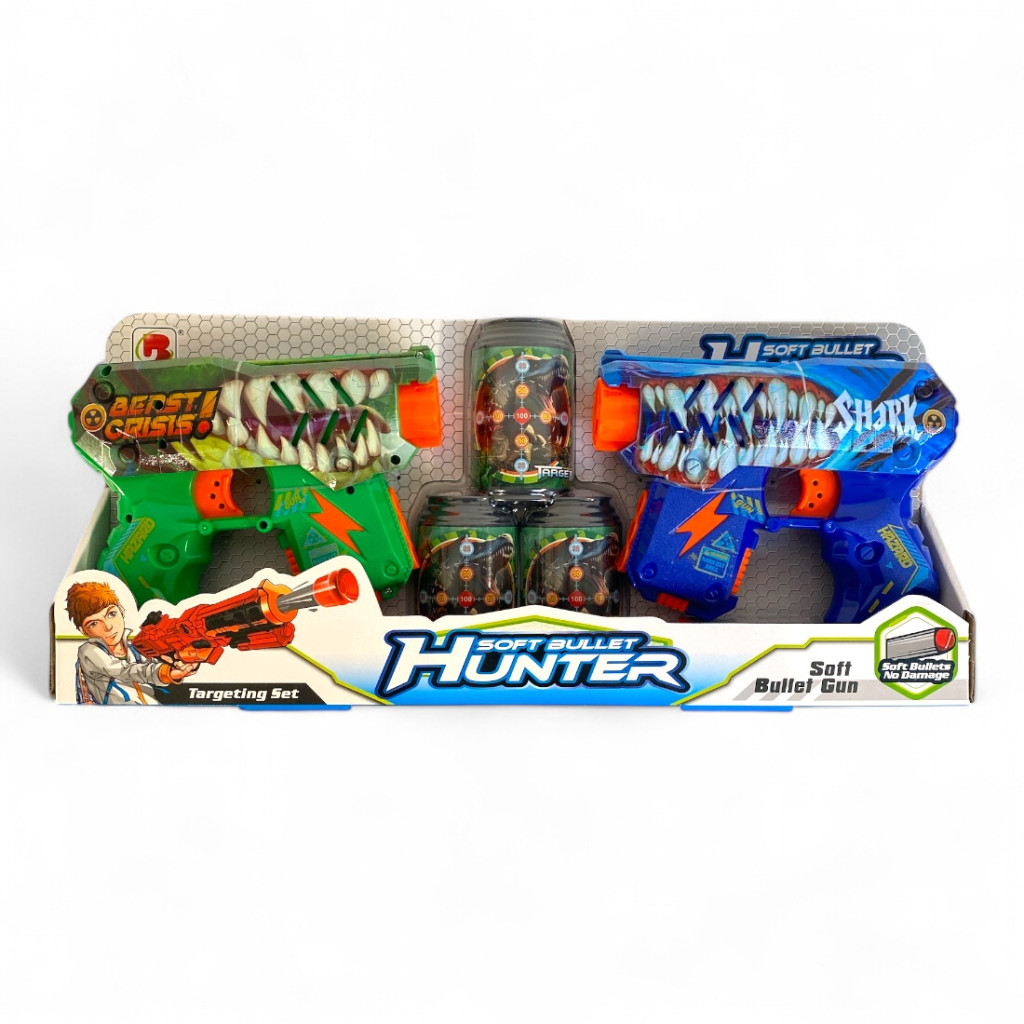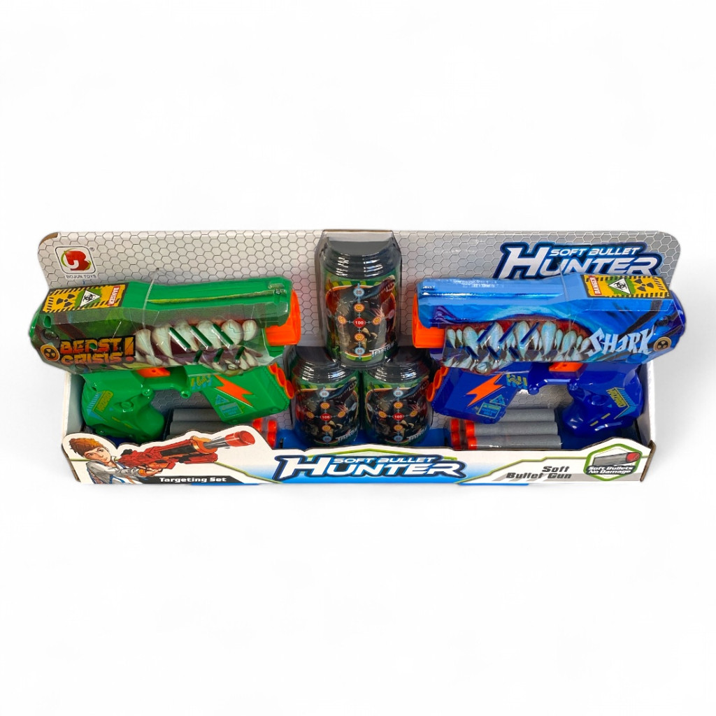 Készülj fel egy izgalmas párbajra ezzel a Soft Bullet Hunter szivacslövedékes célbalövő szettel! A csomagban két látványos pisztoly található – egy dühös cápa és egy vad ragadozó fogainak dizájnjával –, hogy minden játék még izgalmasabb legyen. A készlet tartalmaz három célpontként szolgáló palackot, amelyeket el kell találni a szivacslövedékekkel.