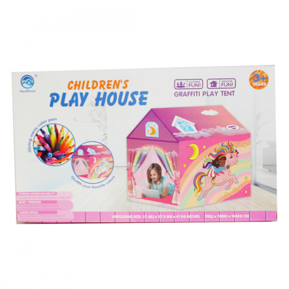 Hozd el az unikornisok varázslatos világát a gyerekszobába ezzel a színezhető játékházzal! Az egyszarvús graffiti sátor nem csupán egy klasszikus játékház, hanem egy kreatív alkotótér is, ahol a gyerekek saját képzeletük szerint díszíthetik fel. Az oldalain található fekete-fehér minták életre kelnek, amint a kicsik kezükbe veszik a mellékelt színes filctollakat, és kedvük szerint kiszínezik őket. Ha meggondolták magukat, sebaj, lemosható amit kiszíneztek így bármikor újra tudják kezdeni.