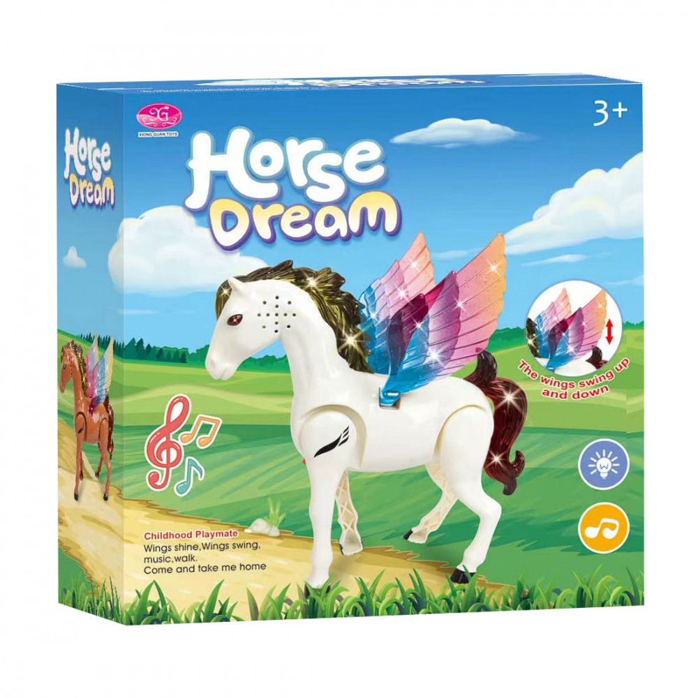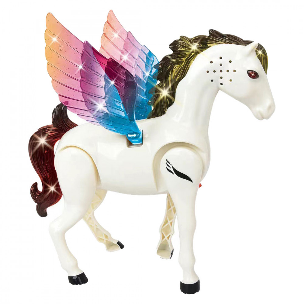 Ez az elemmel működő ló szivárványos szárnyakkal minden kislány álma. Sétál, világít és dalokat is tud játszani.