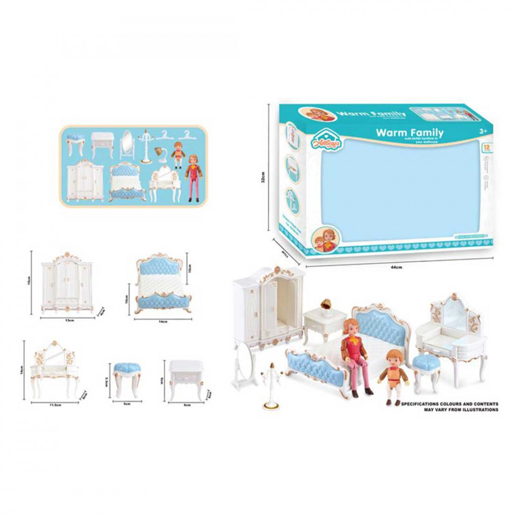 Ennek az aranyos bababútorkészletnek a segítségevel a pici babáidat, figuráidat kényelmesen elhelyezheted. Ezzel a készlettel egy teljes hálószobát tudsz berendezni. A termék tovább tartalmaz két babát is.